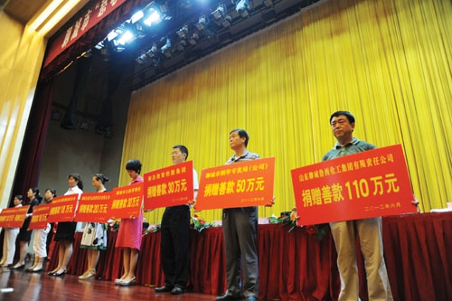 会议传达了省市主要领导对慈善捐助工作的重要批示,对2011年度慈善捐助工作先进单位和个人进行了表彰,市委副书记王忠林、副市长白志坚参加会议并作重要讲话,会议号召全市各界积极行动,参与慈善,爱心奉献。集团公司荣获聊城市“最具爱心捐赠企业”荣誉称号,集团公司董事长张金成被授予聊城市“最具爱心慈善楷模”。会上,集团公司副总经理于清(右一)代表企业进行了善款捐赠,充分体现出鲁西化工对社会慈善事业的大力支持。
